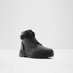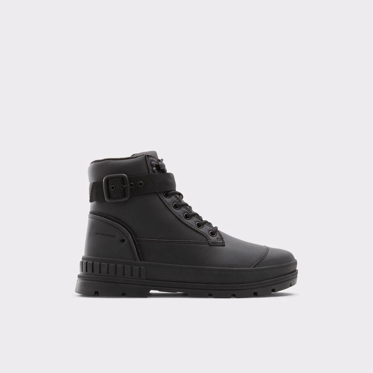 Side buckle, chunky cup soles and lots of edge define these cool, monochromatic lace-up boots.