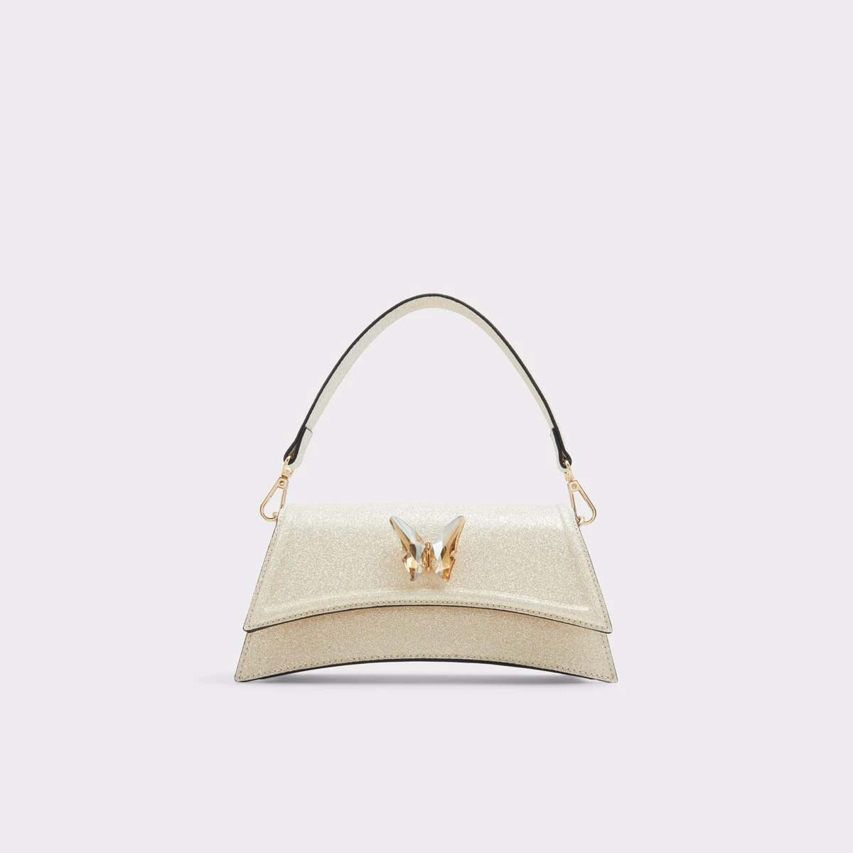 Flutter from event to event with this stunning top handle bag embellished with shimmering glitter and a delicate butterfly-shaped ornament.