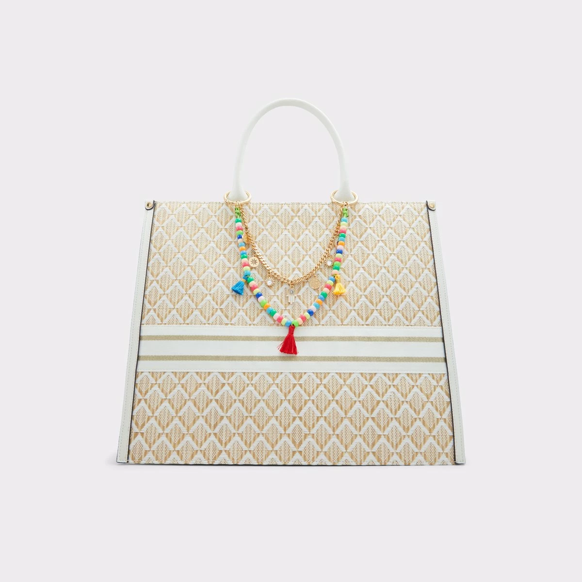 This textured, boho-chic tote with beaded and chain detailing was made for sunny days and beach getaways.