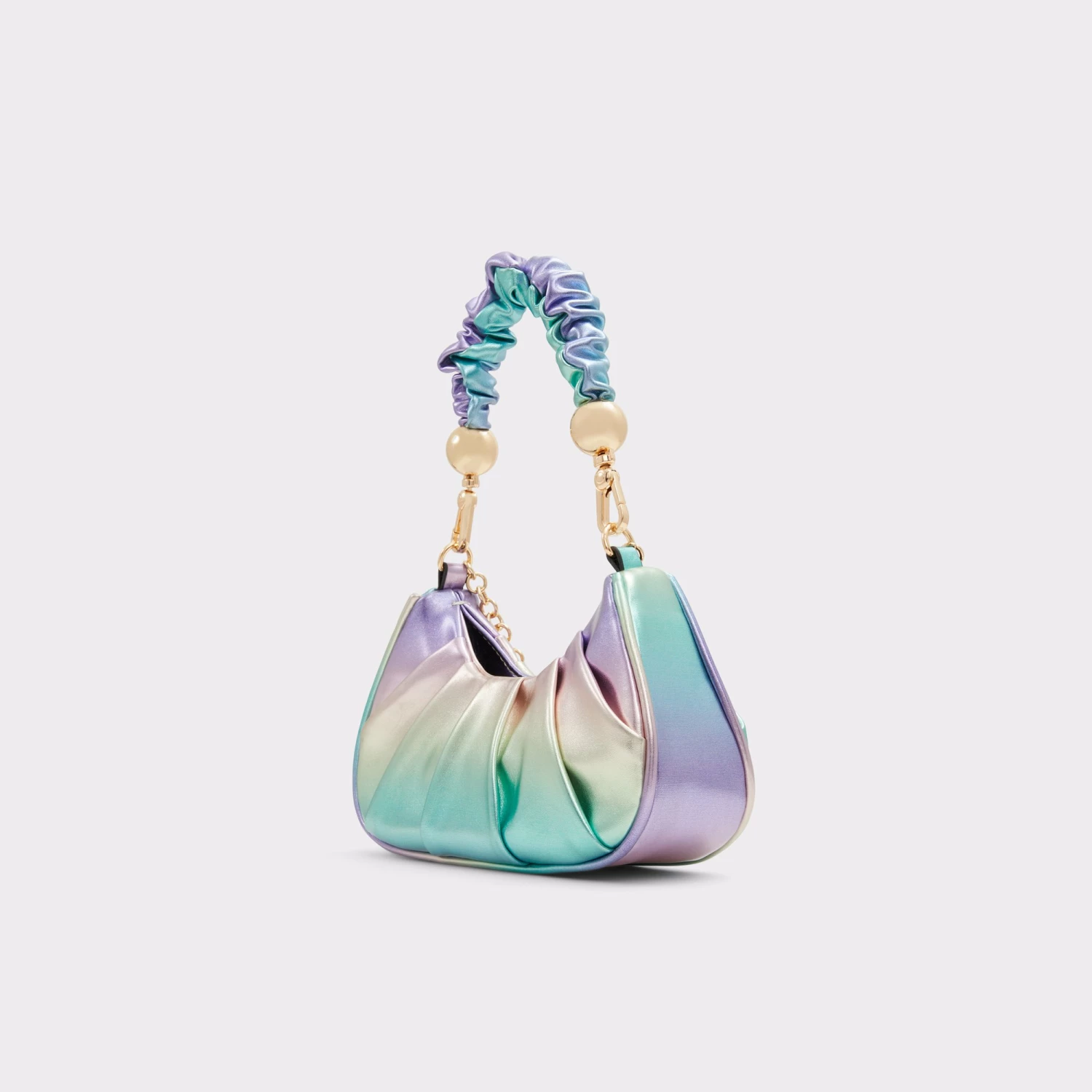 Standout hardware. Ruched handle. Gradient finish. This iridescent shoulder bag is simply dreamy!